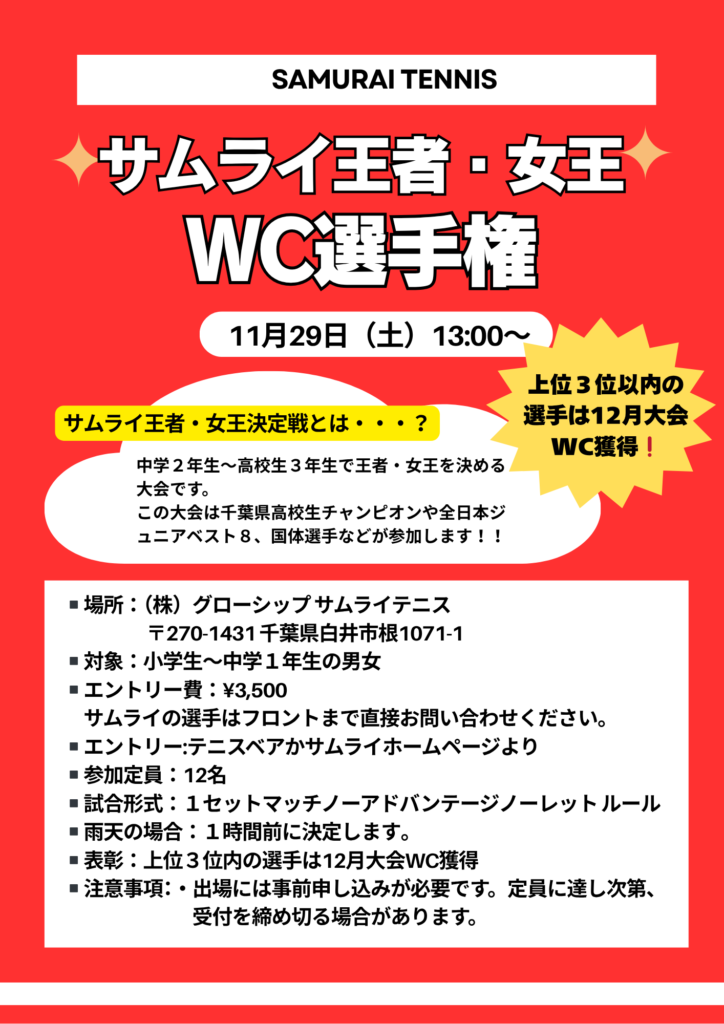✨ サムライ王者・女王決定戦 WC選手権も開催いたします! ✨