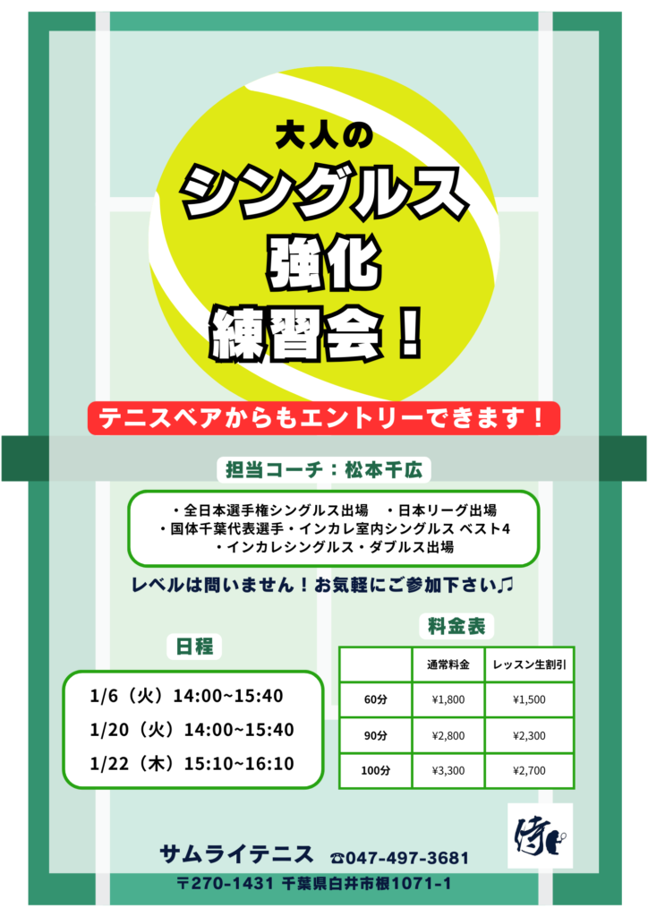 | 1/13(火) 14:00~15:40 | サムライダブルス練習会! | 8名 | テニスベアエントリー |