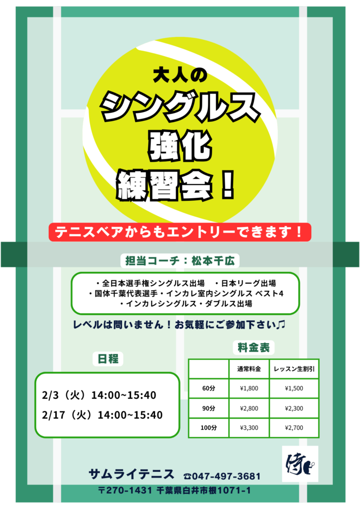 | 2/17(火) 14:00~15:40 | シングルス強化練習会 | 8名 | テニスベアエントリー |