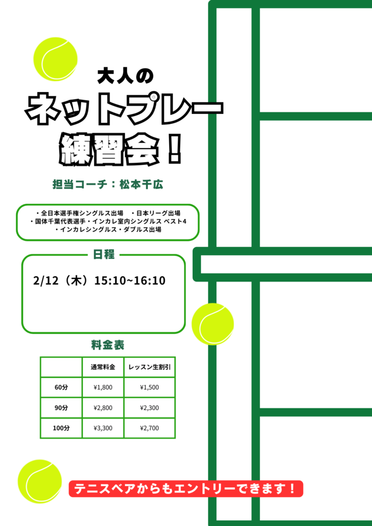| 2/12(木) 14:00~15:00 | ストロークの基礎練習! | 8名 | テニスベアエントリー |