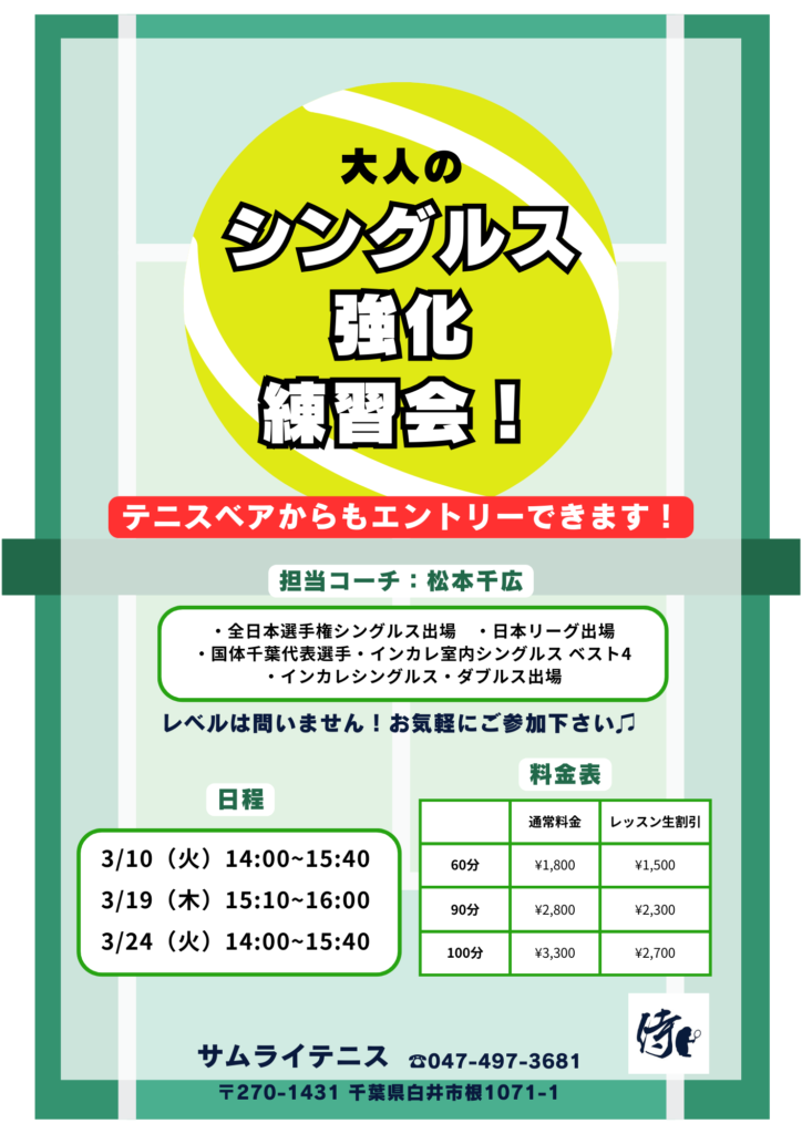 | 3/24(火) 14:00~15:40 | シングルス強化練習会 | 8名 | テニスベアエントリー |