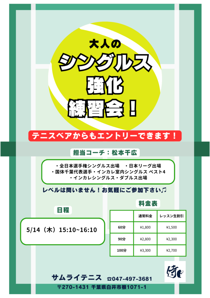 | 5/14(木) 15:10~16:10 | 元日本リーガーと❗️シングルス強化練習会❗️ | 8名 | テニスベアエントリー |