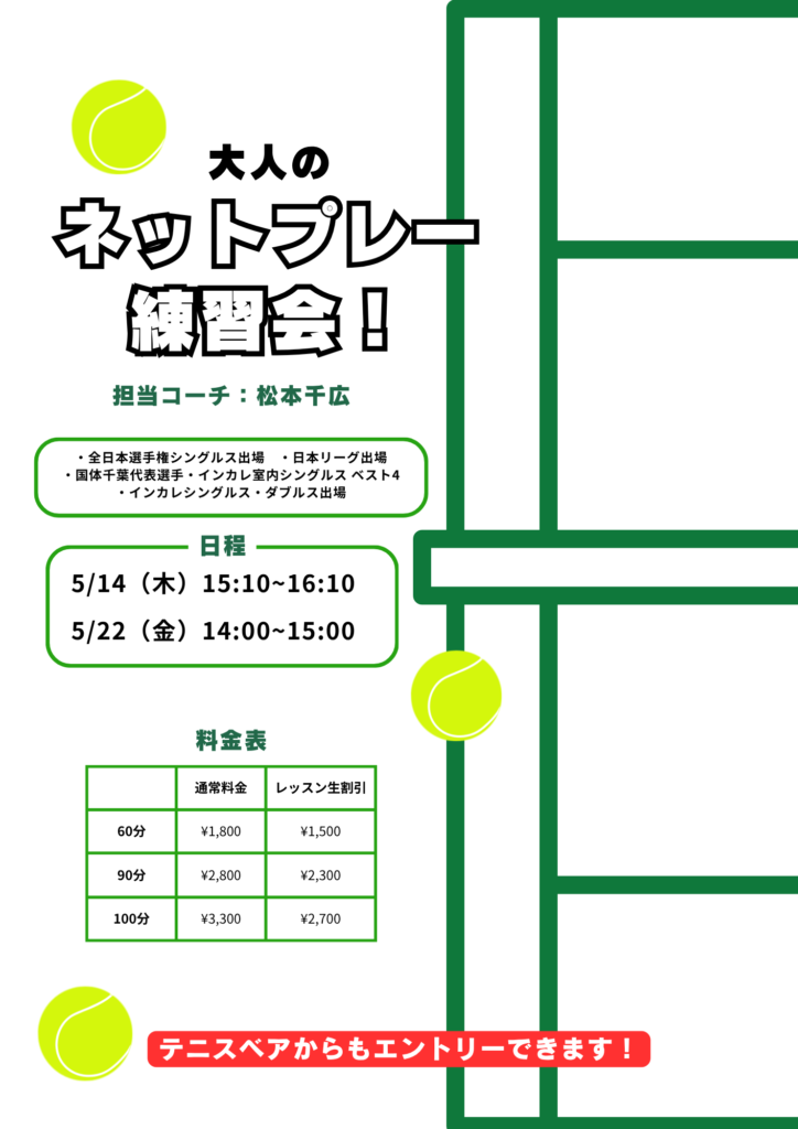 | 5/22(金) 14:00~15:00 | 【ボレー】ローボレーからハイボレーまでネットプレーを鍛えましょう! | 8名 | テニスベアエントリー |